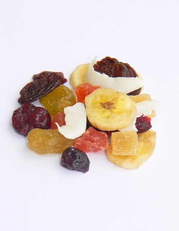 mazsola (mazsola, napraforgó olaj), kandírozott papaya (papaya, cukor, antioxidáns (kén-dioxid)), kandírozott ananász (ananász, cukor, étkezési sav (citromsav), antioxidáns (kén-dioxid)), banán chips (banán, cukor, kókuszolaj, méz, aroma), aszalt, édesített vörös áfonya (vörös áfonya, cukor, napraforgó olaj), arany mazsola (mazsola, napraforgó olaj, antioxidáns (kén-dioxid)), kókusz chips